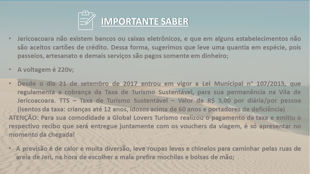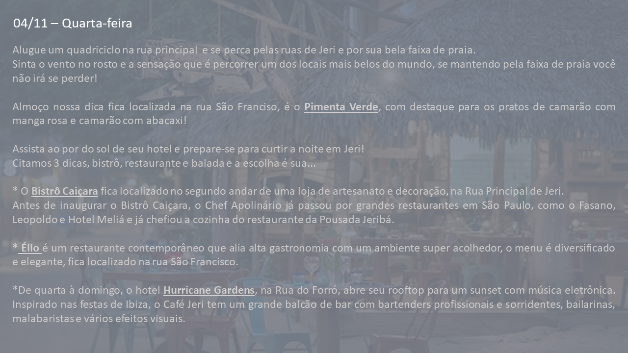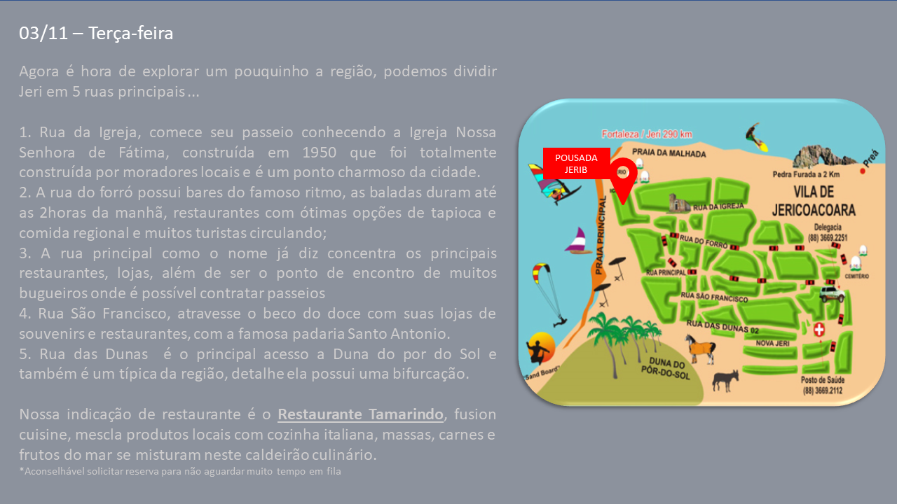 Aqui uma pequena mostra de como você recebe o roteiro… (algumas experiências e dados foram retirados deste modelo para preservar as informações de nossos passageiros)… Modelo Roteiro Jeri 2020